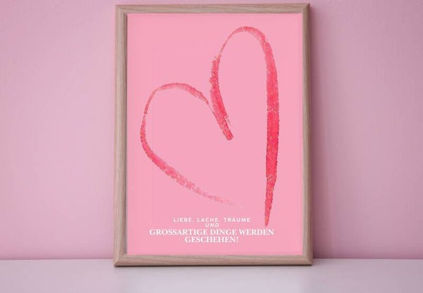 Liebe, Lache, Träume und großartige Dinge werden geschehen! Motivationsposter Herz Print Poster A4 Geburtstagsgeschenk | ausdruckbares Wandbild für Büro, Home Office & Wohnräume | Sofort-Download png-Datei