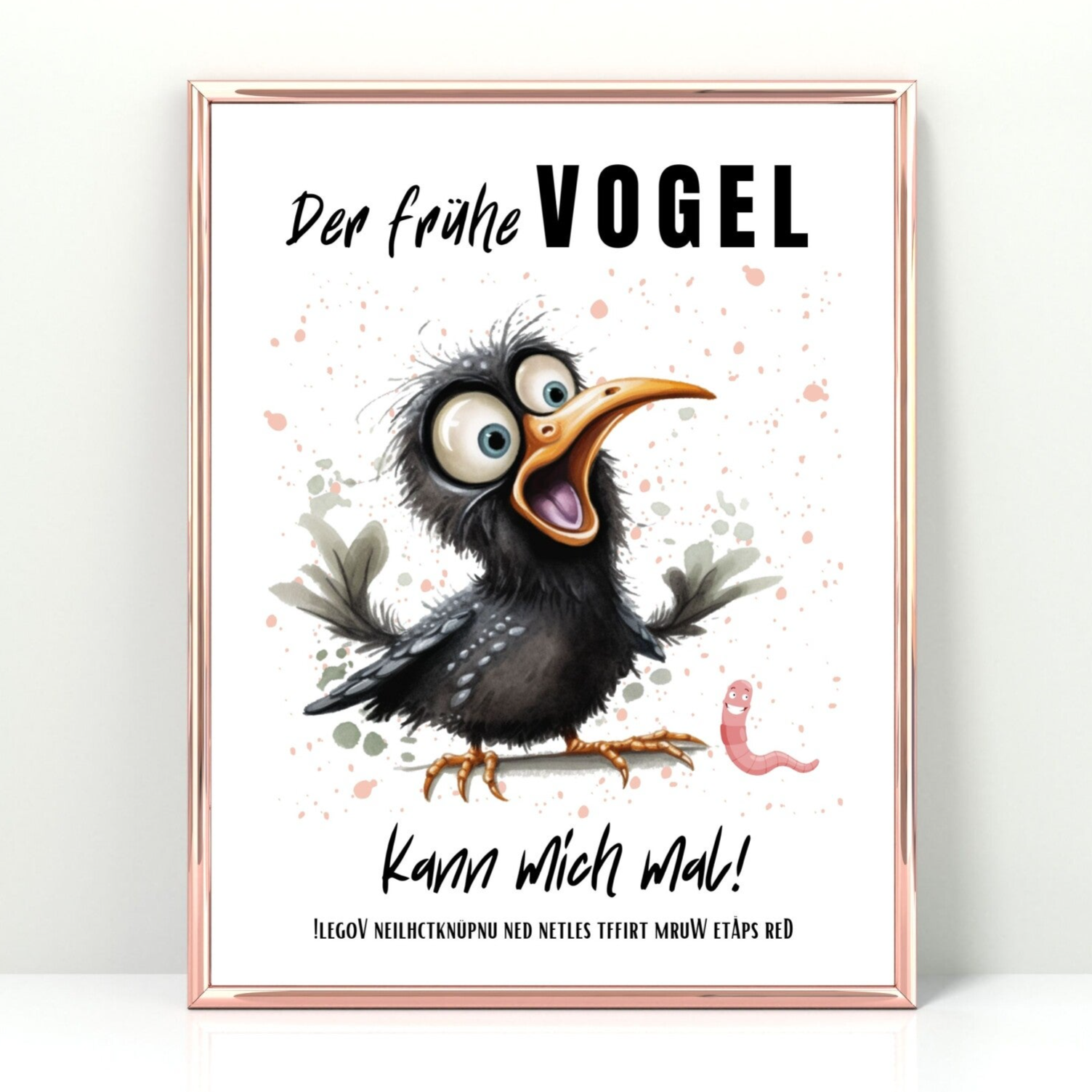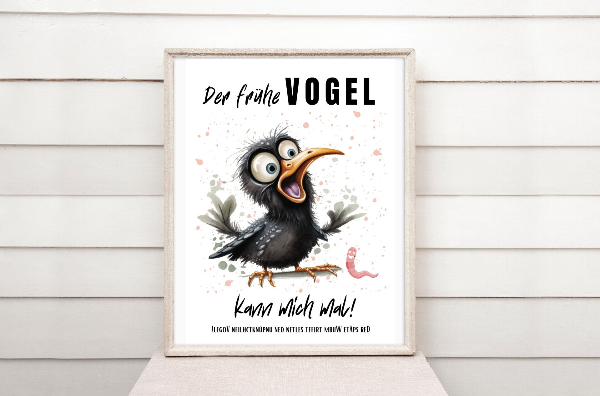 Du bist kein Frühaufsteher? Oder suchst ein originelles Geschenk für jemanden, der seine Morgenstunden lieber ignoriert? Dann ist dieses humorvolle Poster mit dem frechen Spruch „Der frühe Vogel kann mich mal“ sowie einem umgekehrten Spruch zum Nachlesen und Raten genau das Richtige!