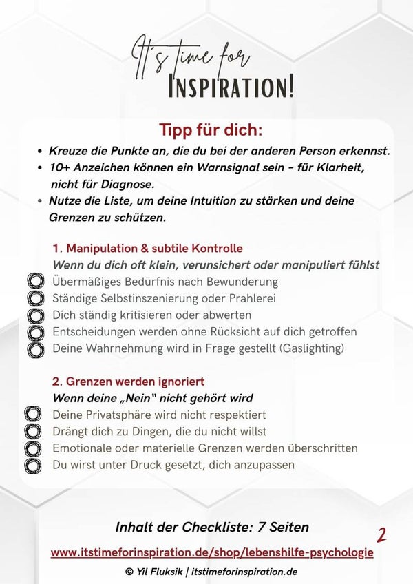 Ich stelle diese Checkliste zur Verfügung, um Menschen zu ermutigen, ihrer Wahrnehmung wieder zu vertrauen, toxische Muster zu erkennen und sich selbst zu schützen.