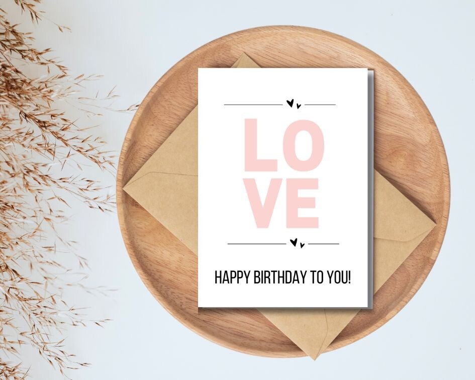 Schenke Freude und Kreativität mit unserer modernen "Klappkarte LOVE Happy Birthday to you" im elegant-minimalistischem Design mit viel Platz für eigene Verzierungen und Notizen! Perfekt, um persönliche Wünsche auf charmante Weise zu überreichen.