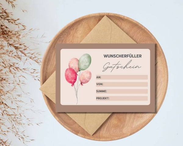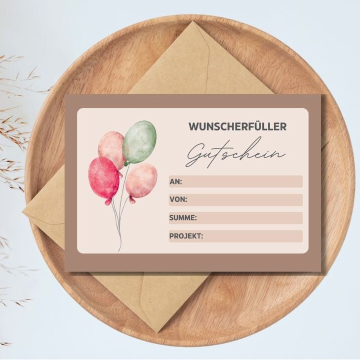Schenke Freude und Kreativität mit unserer stilvollen "Wunscherfüller"-Gutscheinkarte im eleganten Braun-Creme mit schwebenden Ballons in Aquarell! Perfekt, um persönliche Wünsche auf charmante Weise zu überreichen.