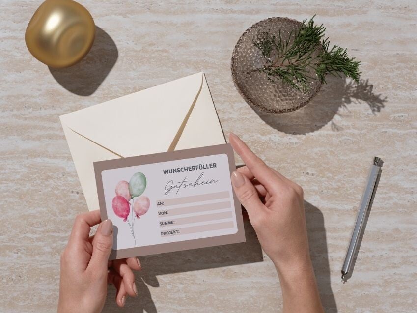 - Drucken: Drucke die Gutscheinkarte auf hochwertigem Papier oder Karton deiner Wahl aus.