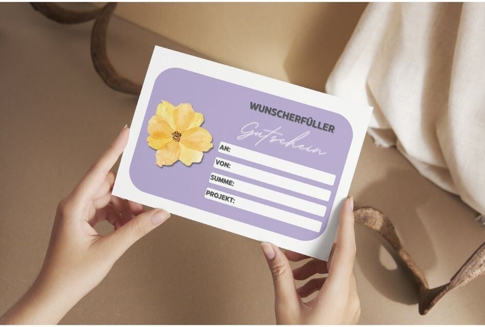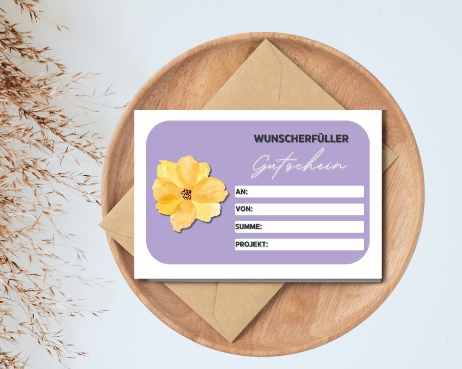 Schenke Freude und Kreativität mit unserer stilvollen "Wunscherfüller"-Gutscheinkarte im eleganten Aquarell-Blumen-Design! Perfekt, um persönliche Wünsche auf charmante Weise zu überreichen.
