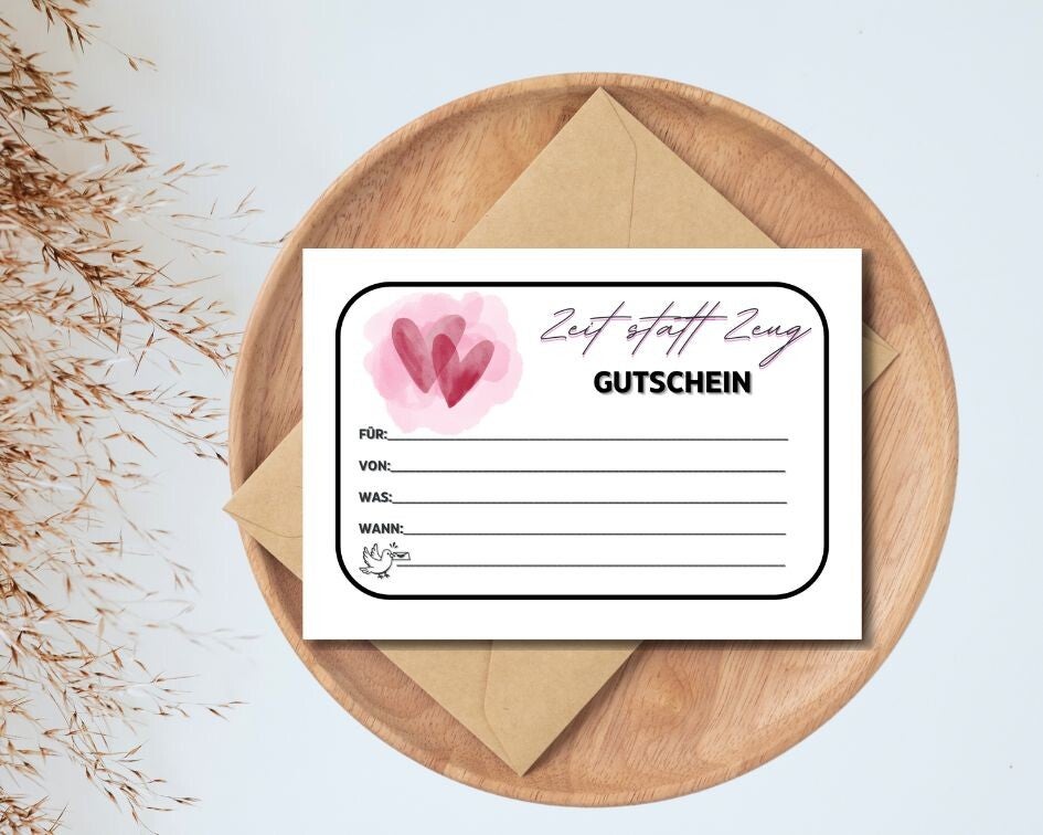 Zeit statt Zeug Gutschein für alle Anlässe & Unternehmungen | Herzen-Design A6 zum Ausdrucken 14,8 - 10,5 cm | DIY Gutscheinkarte selber basteln | einfaches Last-Minute-Geschenk | Vorlage Sofort-Download png-Datei