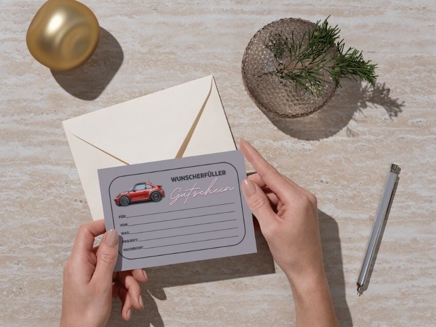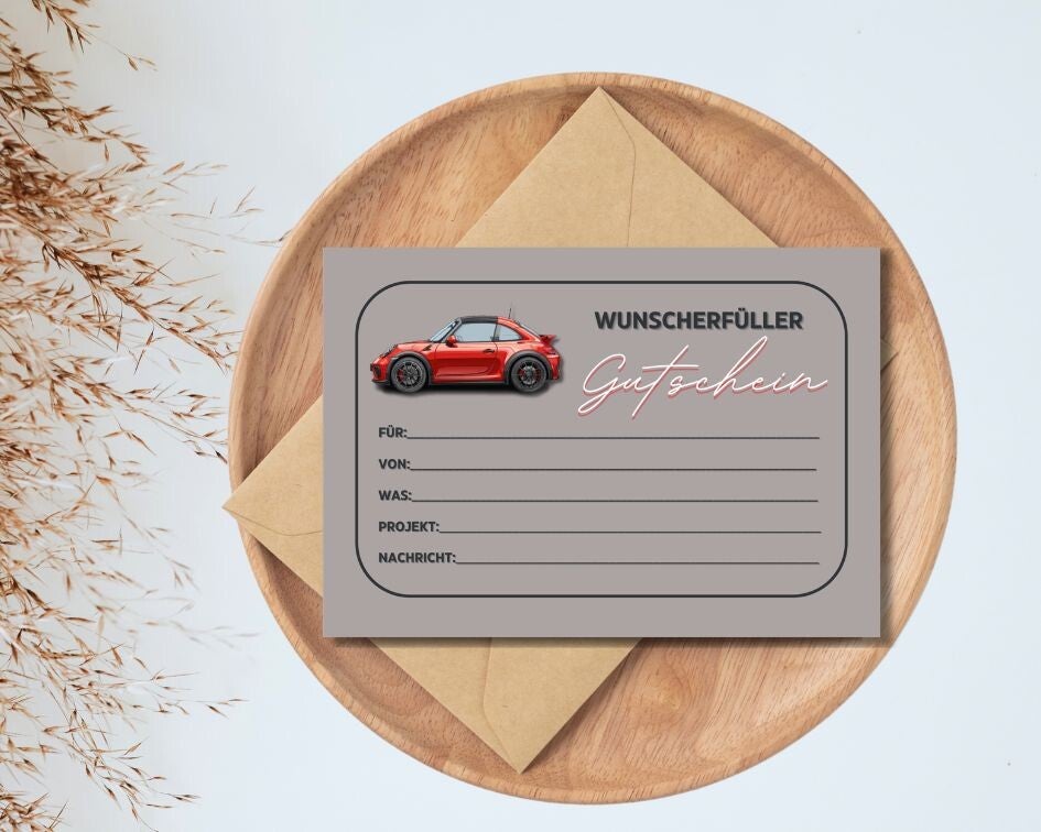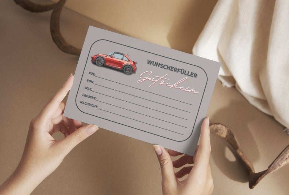 Schenke Freude und Kreativität mit unserer stilvollen "Wunscherfüller"-Gutscheinkarte im minimalistischem Sportwagen-Design! Perfekt, um persönliche Wünsche auf charmante Weise zu überreichen.