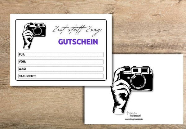 Zeit statt Zeug Gutschein für Fotoshooting | Kamera-Design A6 zum Ausdrucken 14,8 - 10,5 cm | DIY Gutscheinkarte selber basteln | Last-Minute-Geschenk für Frauen & Männer | Druckvorlage Sofort-Download png-Datei